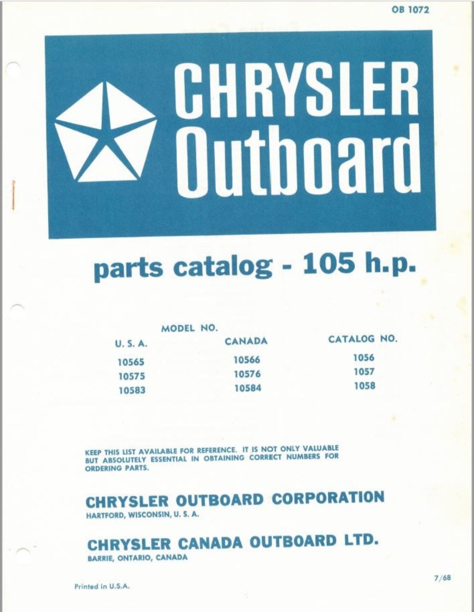 1968 Chrysler 105 HP 10565 10566 10575 10576 10583 10584 Parts Catalog - Used